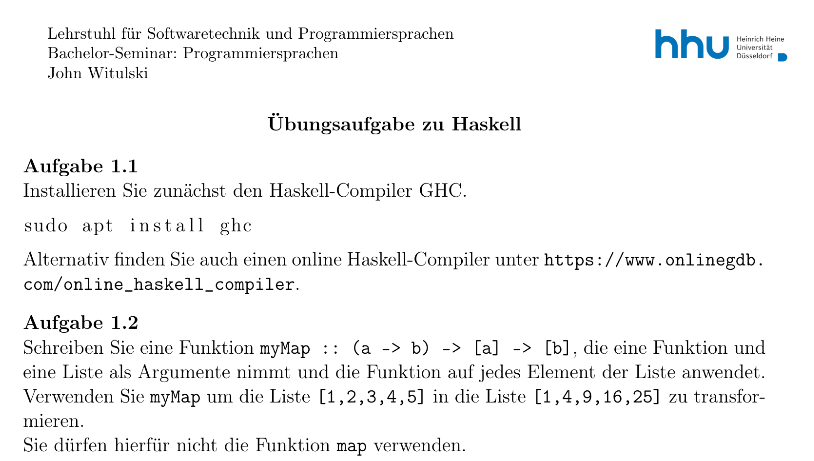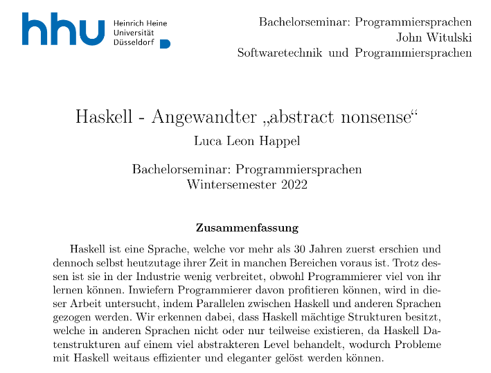 Dieses Semester habe ich einen Kurs in der Heinrich-Heine Universität in Düsseldorf belegt, welcher sich mit verschiedenen Programmiersprachen beschäftigte. Dabei habe ich einen Vortrag über Haskell gehalten, welche eine Sprache ist, die mir sehr am Herzen liegt. Zu dem Seminar gehörte es, einen Vortag über 45 Minuten zu halten, zusammen mit dem Design eines Übungsblattes, welches die erlernten Fähigkeiten in 30 Minuten testen sollte. Außerdem sollte eine Ausarbeitung, welche im Umfang einer Bachelorarbeit war, angefertigt werden und es sollten zwei Rezensionen zu den angefertigten Bachelorarbeiten anderer Studienrenden angefertigt werden.