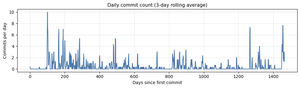 plt.figure(figsize=(10, 3))plt.plot(signal, color="#4C78A8", lw=1.5)plt.title("Daily commit count (3-day rolling average)", fontsize=11)plt.xlabel("Days since first commit")plt.ylabel("Commits per day")plt.grid(alpha=0.3)plt.tight_layout()plt.savefig("daily_commit_count.png", dpi=150, bbox_inches="tight", transparent=True)plt.show()
