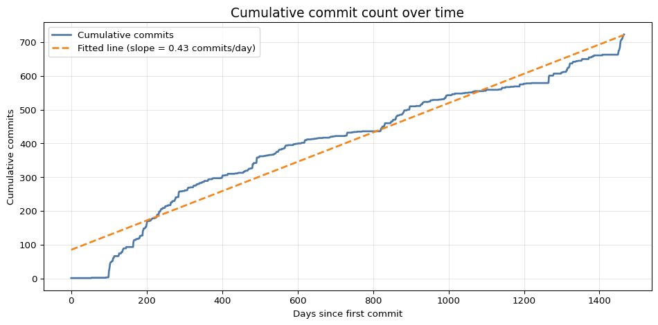 from scipy.stats import linregressimport numpy as npts_sorted = np.array(sorted(c.committed_date for c in commits), dtype=float)t0 = ts_sorted[0]span_days = (ts_sorted[-1] - t0) /86400daily_counts = np.zeros(int(span_days) +1, dtype=float)for t in ts_sorted: day_idx =int((t - t0) /86400) daily_counts[day_idx] +=1cumulative_counts = np.cumsum(daily_counts)days = np.arange(len(cumulative_counts))slope, intercept, r_value, p_value, std_err = linregress(days, cumulative_counts)print(f"Estimated commits/day: {slope:.2f}")print(f"R² value: {r_value**2:.4f}")